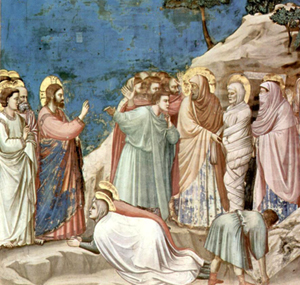 Cuando Jesús llegó, Lázaro llevaba ya cuatro días enterrado. Cuando Marta se enteró de que llegaba Jesús, salió a su encuentro, mientras María se quedaba en casa.